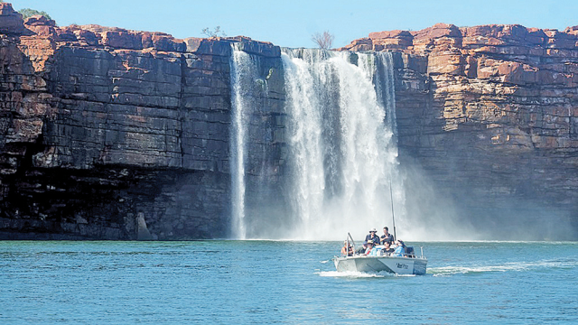 “WE’RE VERY FORTUNATE TO SEE THE FALLS IN SUCH STAGGERING FURY,” yells Paul above the din. It’s true. By the time many of the major international operators arrive in late May, most of the Kimberley waterfalls will have shrunk to a comparative trickle. Others will have disappeared altogether.